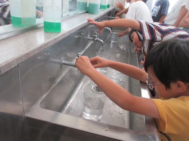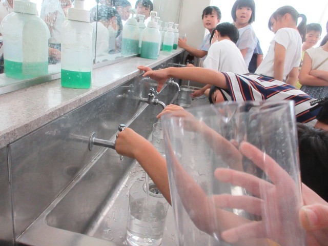 2年算数では、1L の水を予想して容器に入れたり、いろいろな入れ物に入る水のかさを測定したりして、子供たちのかさに対する興味・関心を高め、量感を養っている様子です。