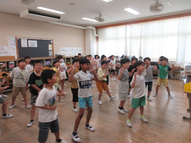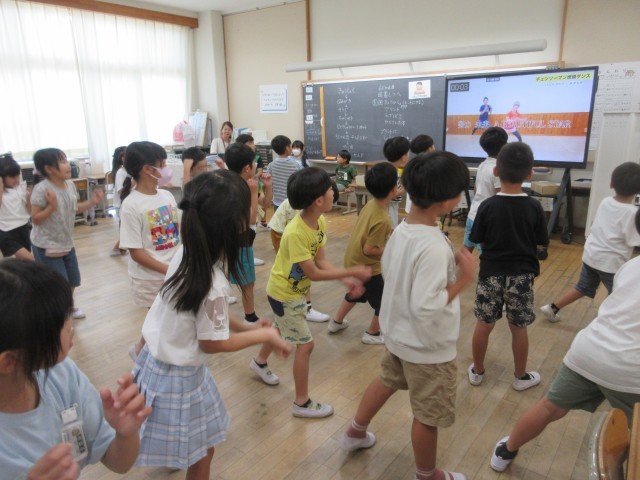 2年音楽では、音楽に合わせて子供たちがダンスを踊っている様子です。WBGTの数値が高く休み時間も体育も外での活動ができないため、音楽の学習でリズムや歌に合わせて体を思いっきり動かし、うっすら汗をかいていました。