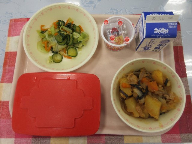 【献立】ごはん 牛乳 納豆 ピリ辛肉じゃが チンゲンサイの酢じょうゆあえ
