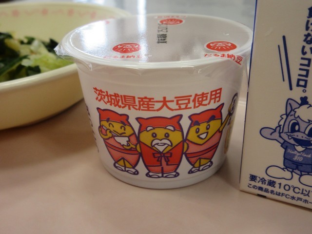 今日の納豆は、茨城県産の小粒の大豆を使用した納豆です。みんなでおいしくいただきましょう。