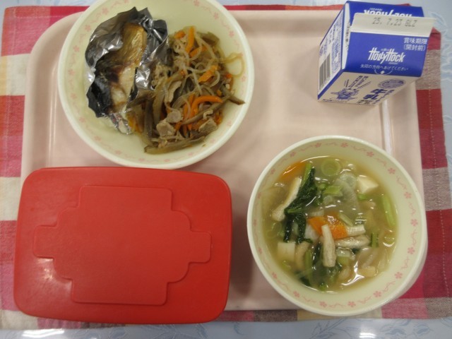 【献立】ごはん 牛乳 さばの塩焼き 五目きんぴら 豆腐と小松菜のみそ汁