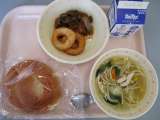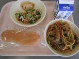 〈献立〉ミニコッペパン 牛乳 那珂湊焼きそば 揚げぎょうざ チキンサラダ 今日...