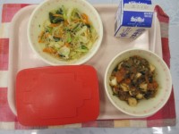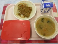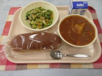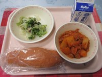 【献立】コッペパン 牛乳 ポークビーンズ グリーンサラダ 【栄養士より一言】 給...