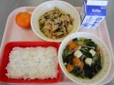 〈献立〉ごはん 牛乳 豚キムチ炒め わかめスープ くだもの 今日は冷凍みかんを...