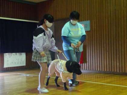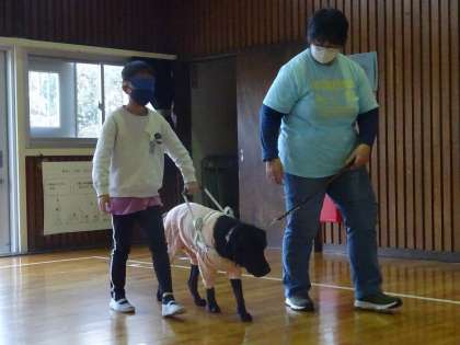 次に,学年の代表の児童が,盲導犬と歩く体験を行いました。感想を聞いてみると,盲導犬に引っ張られる感じがしたり,盲導犬と距離をとるのが難しかったりして,怖さを感じるそうです。