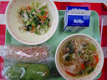 【献立】抹茶きなこ揚げパン 牛乳 ツナサラダ ワンタンスープ