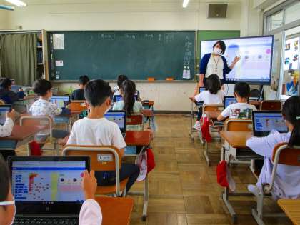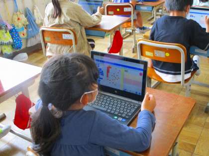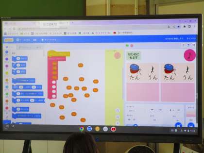 今日は,ICTサポーターの先生が来校し,担任の先生と一緒にプログラミングの学習を進めています。写真は,2年生がプログラミングで,音楽のリズム打ちにトライしている様子です。「タン・うん・タン・うん」先生のお手本を見ながら,何をどのようにプログラムするか理解し,練習。後半はオリジナルのリズムのプログラミングに挑戦できました。