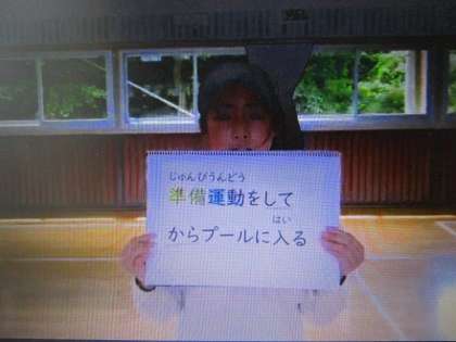 先週,体育委員の5・6年生の児童と各学級の代表児童の協力を得て,プール開きの様子を撮影しました。今週から水泳学習が始まることから,本日各学級において「プール開き」の映像を見て,水泳学習の注意点等について確認をしました。代表児童の目標を聞くことで,一人一人の目標を持つことができたと思います。※写真は,画面越しのもののため不鮮明です。
