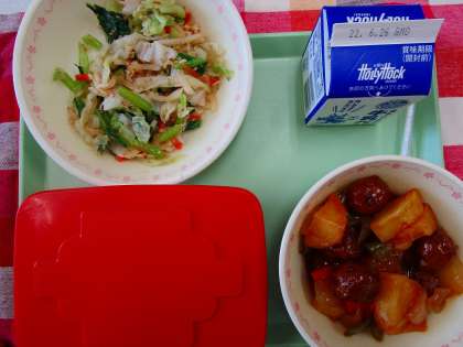 【栄養士より一言】給食には、酢を使った料理が時々登場します。酢は、人間が作り出した最初の調味料ともいわれ、古代エジプトの時代からあったそうです。酢のすっぱいのが苦手という人もいるかもしれませんが、酢には、疲れをとったり、血液をサラサラにしてくれたり、ばい菌をやっつけてくれて、食べ物を腐りにくくしてくれたりと、良いことがたくさんあります。 今日の肉団子の甘酢あんに酢を使っています。味わって食べてください。