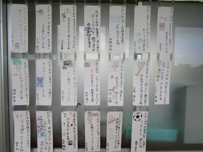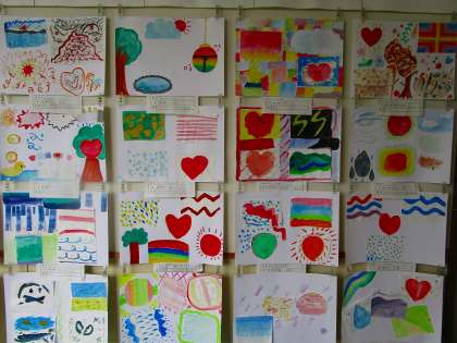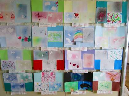 3階のフロアは子供たちの作品があふれています。4年生は図工「絵の具ゆめもよう」で描いた様々な技法を使った工夫ある作品。5年生は図工「心のもよう」で自分の心の中を色や形に表した色とりどりの作品。6年生は,書写「短歌を書こう」と国語「たのしみは」をリンクして学習した,好きなことを歌にした作品。廊下を通るときは思わず足を止めたくなります。