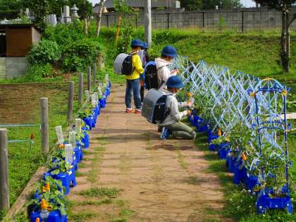1年生と2年生は,一人一鉢アサガオ(1年生)や野菜(2年生)を育てています。2年生は登校するとすぐさま,野菜の生長を観察し,たっぷりの水をあげています。何人かの児童はすでに収穫もできているようです。そのため,自分のトマトは?キュウリは?なすは?と角度を変えながら一生懸命観察し,「げんきにそだってね!」と声かけを行っています。