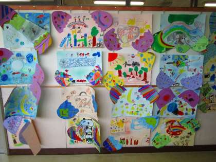 2年生の教室廊下に素敵な作品が飾られていました。不思議な色合いの模様をした“たまご”。その“たまご”の中から何が生まれてくるかな?というテーマから,一人一人がたまごから生まれてくるものを想像し、イメージを膨らませて形や色にして表現しています。