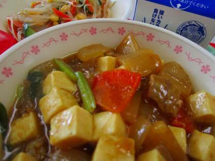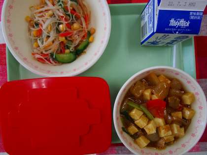 【献立】ごはん 牛乳 豆腐のカレー煮 春雨サラダ