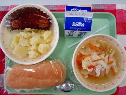 【献立】コッペパン 牛乳 フランクフルトチリソース 粉ふきいも ジュリエンヌスープ