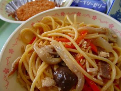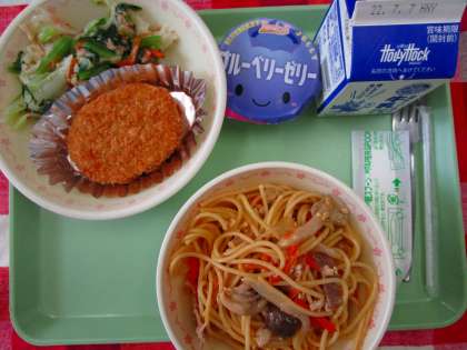 【献立】和風スパゲッティ 牛乳 コロッケ 小松菜サラダ ブルーベリーゼリー