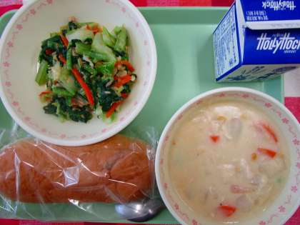 【献立】レーズンパン 牛乳 米粉の豆乳シチュー ガーリックドレッシングサラダ
