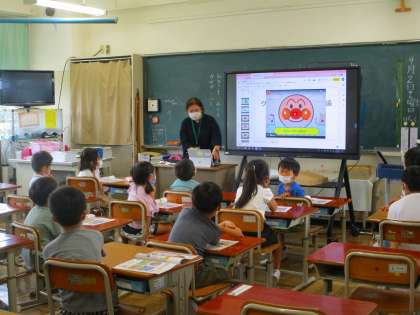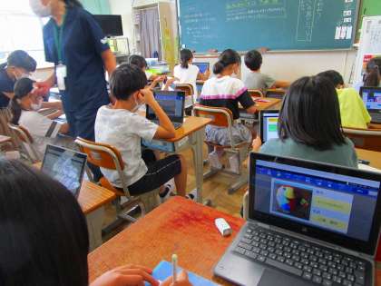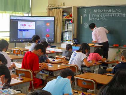 夏休みに,先生方のICT活用に関する研修を行いました。今日から前期後半の授業が本格的にスタートしています。どの学年も,タブレットや電子黒板を有効活用した授業を行っています。写真左:1年生の音楽(映像を見ながら歌唱)/写真中央:4年生の図工(作品カードの作成)/写真右:5年生の理科(アサガオのつくりの観察)