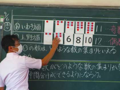 子供たち一人一人が「分かった」「できた」を実感できるような授業を日々私たち教員は目指しています。今日ご紹介する授業は,5年生の算数「整数の性質」の様子です。電子黒板や従来どおりの黒板を活用しています。文字だけでなく,図や表などを関連付けて用いることで,より分かりやすくなるように努めています。また,自分の考えと友達の考えを交流し,考えを広げ深めることも行っていました。授業の終末では,本時の授業のまとめを行い,学んだことを活用して解いた適応練習問題で,さらに理解を確かなものにすることが出来ていました。