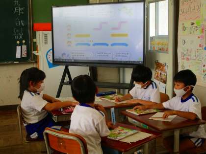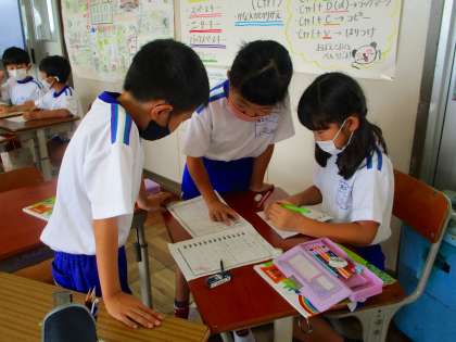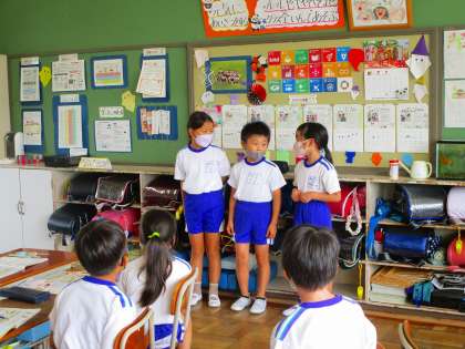 2年生の教室では,班のお友達と話し合いを行っていました。子供たちは,身の回りの「音」を声で表してどんな音楽を作ろうか,と話し合っているところでした。リズムに合わせて,話し合って出来たところまでの音楽(犬や猫の鳴き声)(バイクや掃除機の音)を発表していました。