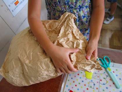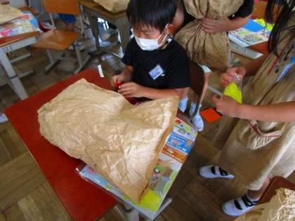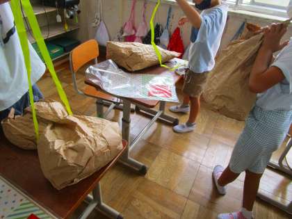 2年生が大きな紙袋に,新聞紙やシュレッダーで裁断された紙を詰めて,なにやら形作っていました。自分が作りたい「動物」をイメージして,大まかな形を作るために,詰め物の量を調整しながら紙袋の形を変形したり,リボンでしばったりして形を整えていました。一人一人試行錯誤しながら,想像を膨らませて取り組んでいました。完成が楽しみですね!