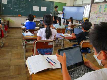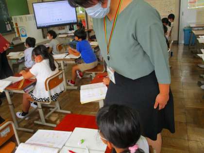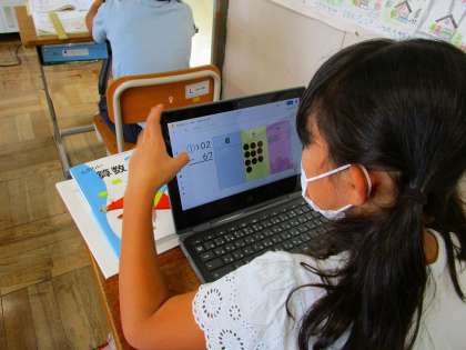 2年生は,「3位数−2位数」の学習をしています。今日の学習課題は,「十の位から繰り下げられないときのひっさんの仕方を考える」でした。子供たちは,昨日までの学習を応用して,一人一人自力解決していました。タブレットのJamboardを使って,位取りを操作しながら確かめる場面では,理解を深めていました。百の位から借りてくることを誰もが理解し,筆算にも表すことができました。適応問題では,今日のまとめを確かめながら練習できました。2年生は,タブレットをサクサクと使いこなしていました。