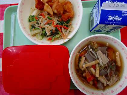 【献立】ごはん 牛乳 鶏肉とじゃがいものみそバター ごま酢あえ たぬき汁