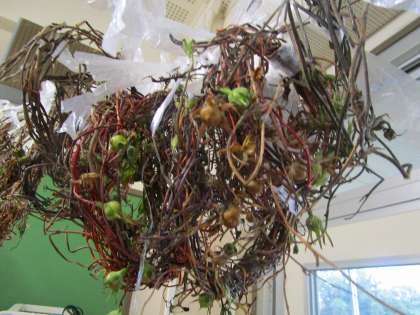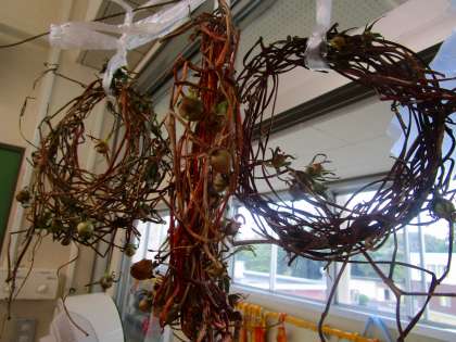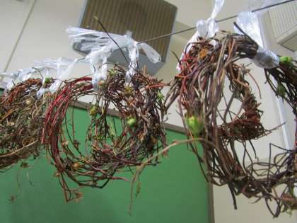 一年生の教室に行くと,アサガオのツルがリースの形になっていました。上手にできたね,と子供たちに話しかけると,「自分で丸められたよ!」「先生に手伝ってもらった。」など嬉しそうに話してくれました。このあと,自分好みに飾り付けをすることになります。楽しみですね。