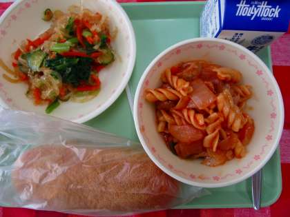 【献立】きな粉揚げパン 牛乳 肉団子とマカロニのトマト煮 寒天入りヘルシーサラダ