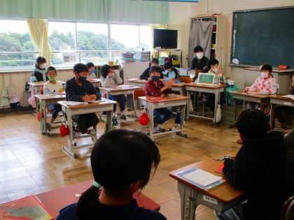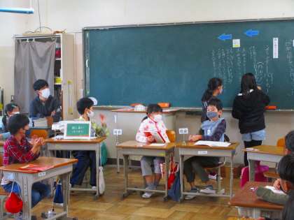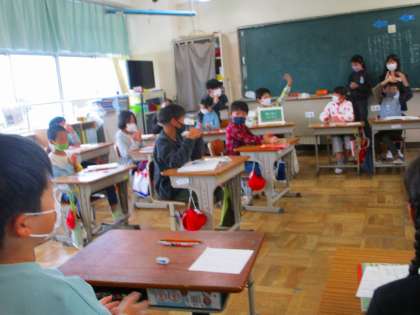 4年1組さんが,話し合い活動を行っていました。司会,書記やタイムキーパーなどの役割を設け,子供たちは真剣に話し合っています。みんなからの意見を出し合ったあと,比べ合いの時間には,友達の考えのどの点が自分と同じなのか,どこが違っているのか,意見を見極めて,誰もがよりよいまとめになるように話し合いに取り組んでいました。