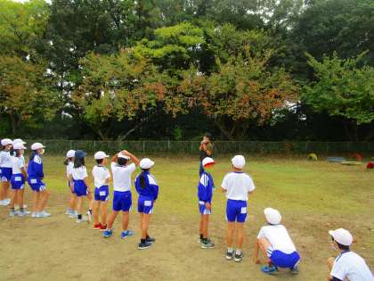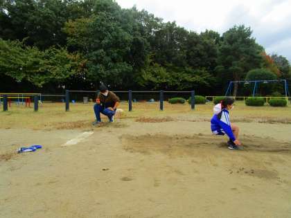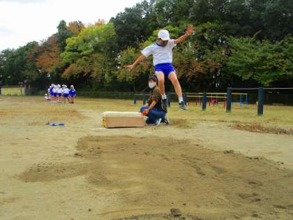 立ち幅跳びは,毎年実施している体力テストで経験していますが,走り幅跳びは今日が初めて。授業の始めに映像で,跳び方のコツを頭でイメージトレーニングをしました。全員1回跳んだ時点で,先生が実演を交えながら,手の位置,着地の仕方を再確認しました。2回目以降の実践では,前方に向かって高く跳ぶことを意識しながら,一人一人挑戦できていました。