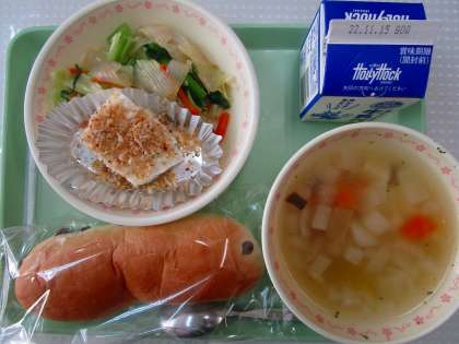 【献立】ぶどうパン 牛乳 真鯛の香草焼き こんにゃくサラダ マセドアンスープ