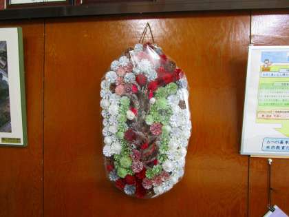 学校校務員の木村先生が,松ぼっくりなどにカラフルな色付けをして,立派なリース飾りを自宅で作ってきてくれました。これは,毎年恒例のように制作してくれているので,子供たちも先生方も,楽しみにしている“堀口小あるある”の1つです。早速,校長室と職員玄関に飾らせていただきました。※写真左:校長室(全長60cm)/右:職員玄関(全長50cm)の超豪華リースです。