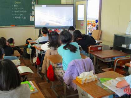 かつて,映像を見る時は教室のテレビモニターに映し出して見ていました。電子黒板が教室に入ってから,映像を電子黒板で見ることができます。4年生の教室から,理科の単元「季節と生物 秋」に関するナレーションが聞こえてきました。教室へ行ってみると,子供たちが身を乗り出しながら,映像を見ていました。このように電子黒板の様々な活用法を,教職員間で共有し,授業で生かしています。