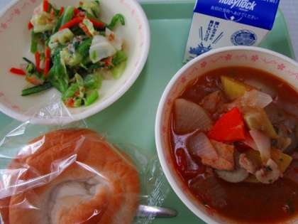 【献立】米パン 牛乳 根菜のブラウンシチュー オニオンドレッシングサラダ