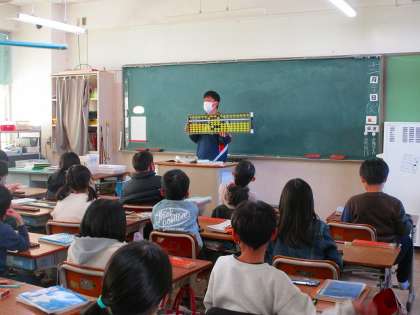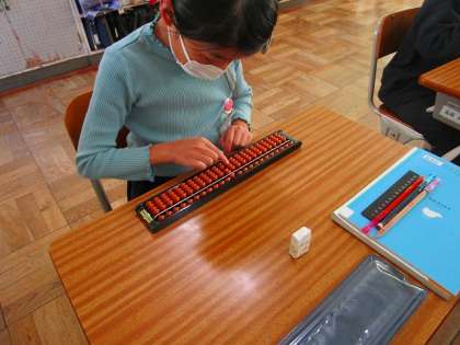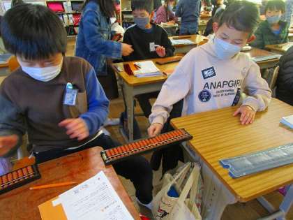 3年生・4年生の算数では,そろばんの学習をします。写真は,4年生の様子です。昨年度学習したことを振り返りながら,そろばんを用いた小数のたし算の仕方を学んでいます。先生が出した問題の答えを友達と確認しながら,十進位取り記数法の仕組みと関連付けて取り組んでいます。