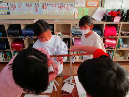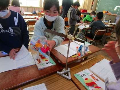 グループの友達と協力して,重さ調べをしていました。単元の導入の本時では,天秤を使いました。左右の天秤が釣り合うように,おもり(ブロック)の数を調整しながら「のり」「はさみ」「セロハンテープ」などの重さを量っていました。授業の後半は,一つ一つの重さを調べたことを基にして,重さが等しくなるように様々な文具を入れて測っていました。