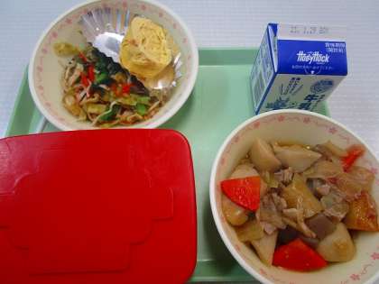 【献立】ごはん 牛乳 厚焼きたまご おかかあえ 里いもと豚肉の煮物