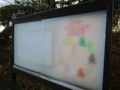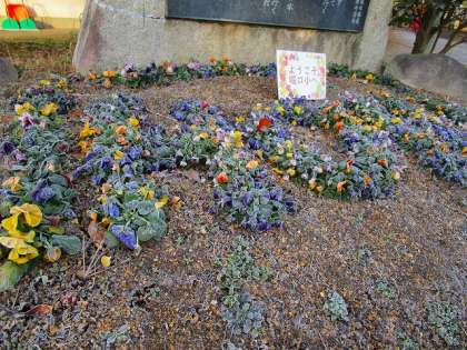 昨日が雨だったことと,今朝の気温が低かったことが重なって,植物や水たまりなど,凍っているところがたくさんありました。朝日に照らされて,キラキラと光っている学校周辺の様子が,いつもと異なり,その美しさに感動して「すごーい!光ってる!!」と発している児童もいました。朝日が当たらない「花壇(ビオラ)」や「掲示板」は真っ白でした。