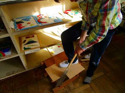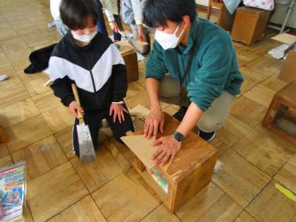 題材「ギコギコトントン クリエーター」では,自分がデザインした仕上がりをイメージして,図面におこし,板に書き写し,切り取る流れで作業を進めます。のこぎりの両刃の太目,細目を木目に合わせて切ることを想定して,板向きを考えて,図面を書き写すのが,第一の難関です。第二の難関は,自分が作りたい形どおりに,切り落とすことです。仕上がりまで時間がかかりますが,ケガのないようにがんばってください!