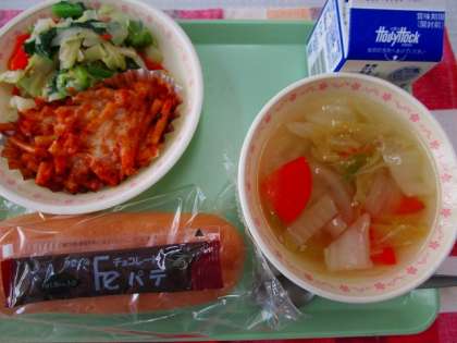 【献立】コッペパン チョコクリーム 牛乳 ミートグラタン ガーリックドレッシングサラダ コンソメスープ