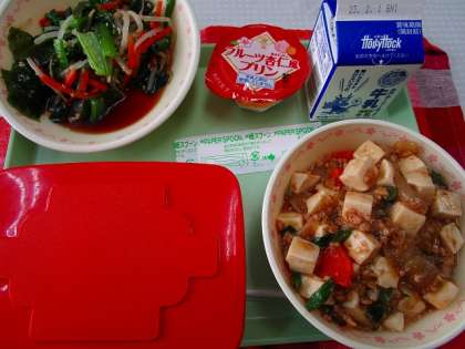 【献立】ごはん 牛乳 四川風麻婆豆腐 こんにゃくサラダ 杏仁豆腐