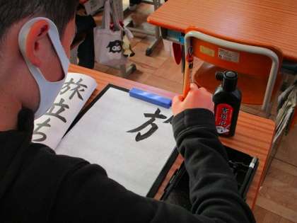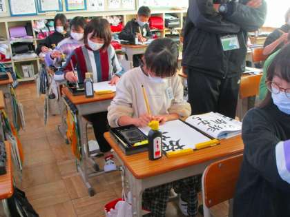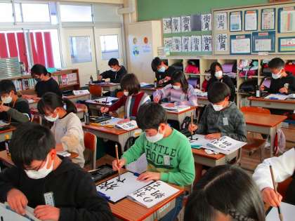 書写の時間も,残りわずかとなってきた6年生。今日は課題は「旅立ちの朝」です。年度始めに,平仮名文字で書いた「さみだれを・・・」のところを振り返りながら,半紙のどこを中心と考えて書けばよいのか,平仮名と漢字の大きさや筆の運びなど,石川先生が丁寧に解説していました。子供たちは,これまでの知識・技能を活用して取り組んでいました。