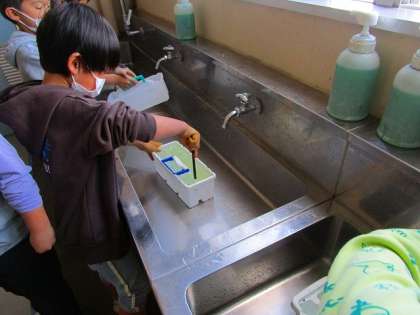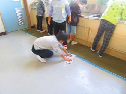 1年生が図工の学習を終えて,片付けを行っていました。筆洗と筆を洗っているうしろで,もくもくと床掃除をしてくれている児童がいました。「床が濡れていたので」と,自主的に拭いていたのです。本校は,階段の踊り場に手洗い場があります。誰もが気持ちよく通れるように,綺麗にしてくれていました。心と行動が成長している姿に,感動しました。
