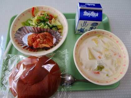 【献立】黒パン 牛乳 米粉のフライドチキン レモンドレッシングサラダ 白菜のミルクスープ