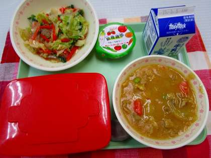 【献立】ごはん 牛乳 昔のカレー こんにゃくサラダ 給食週間ゼリー