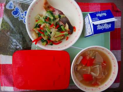 【献立】ごはん おにぎり用焼きのり 牛乳 鮭の塩焼き 即席漬け すいとん汁