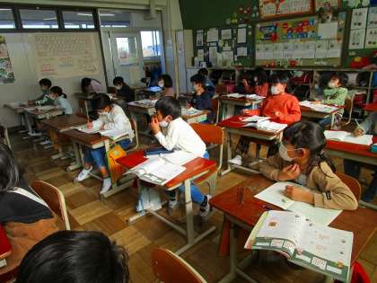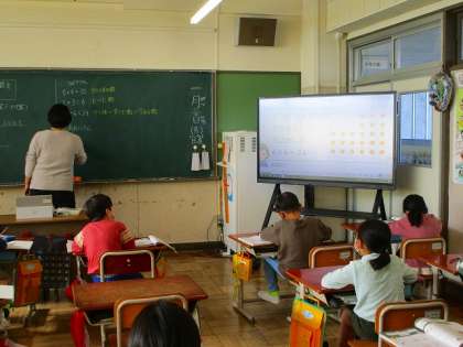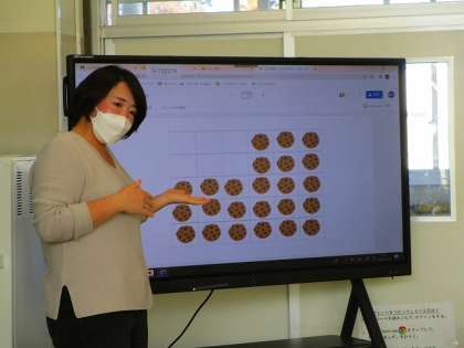 写真中央のように並べられているコインをどのように工夫して数えればよいか,考えている場面です。6×4=24 こたえ 24まい というお友達の考えを,図に表すとどうなるか,みんなで考えています。算数の学習では,式と図を関連づけて考えることが大切です。コイン図が,6×4出あることが分かるように,囲む?一部を移動する?など,みんな真剣に考えていました。