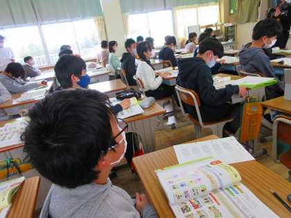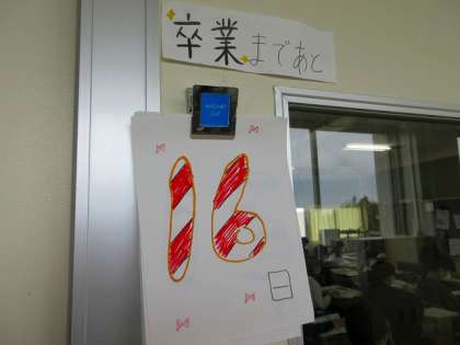 単元「Junior High School Life」の学習風景です。AETの先生のネイティブな発音をしっかりと聞き取り、楽しく学んでいました。卒業までのカウントダウンが「16」になってしまいました。(T-T)