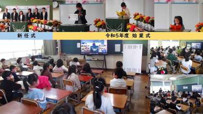 新しく赴任された6名の先生と復帰された2名の先生が加わり、令和5年度がスタートしました。今年度より、新しい試みとして、オンラインで新任式・始業式を行いました。子供たちは、運動場に整列することがなかったので、新しいクラスで、座席を確認したり、ロッカーやフックに荷物をおいたり、お友達と話をしたりなど、ゆったり時間を使うことができました。そのため、落ち着いた雰囲気で式に臨むことができました。式では2名の代表児童(新2年・6年)が今年度の意気込みを発表してくれました。