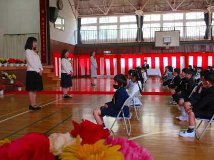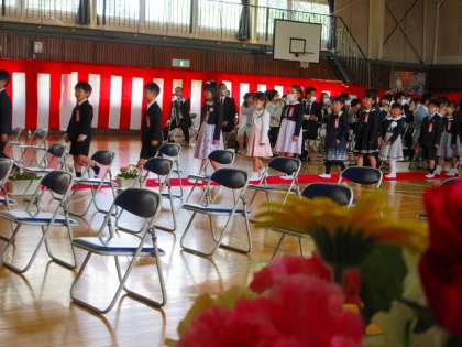 春風に桜の花びらが舞う中、49名の1年生が入学しました。ご入学おめでとうございます。在校生・教職員は、1年生の入学を心待ちにしていました。式は約1時間でしたが、1年生の子供たちは、姿勢よく式に臨んでいました。入学式は、リハーサルなしの本番でしたが、とてもよく頑張っていました。月曜日から、通学班での登校になります。高学年のお兄さん。お姉さん(班長・副班長)たちと一緒に、安全に登校してきてください。